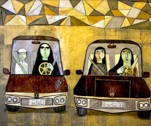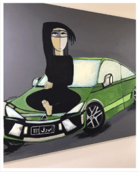 “I care about issues that surround my community. Women driving is one of those issues and I painted about it. The work in which the woman embraces the car is an old work, one that was withheld because of my demand for driving in the past.”
