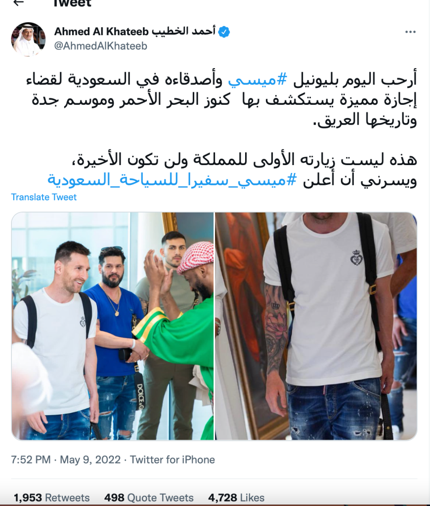 وقال الوزير السعودي، عبر حسابه على تويتر: “أرحب اليوم بليونيل ميسي وأصدقاءه في السعودية لقضاء إجازة مميزة يستكشف بها كنوز البحر الأحمر وموسم جدة وتاريخها العريق”.